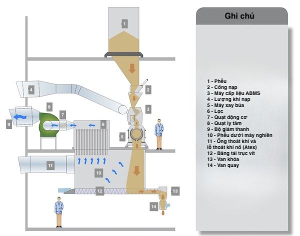 - Cung cấp không khí: Không khí được cung cấp qua bộ nạp khí ABMS và cửa nạp khí bổ sung, hỗ trợ quá trình nghiền và vận chuyển nguyên liệu.